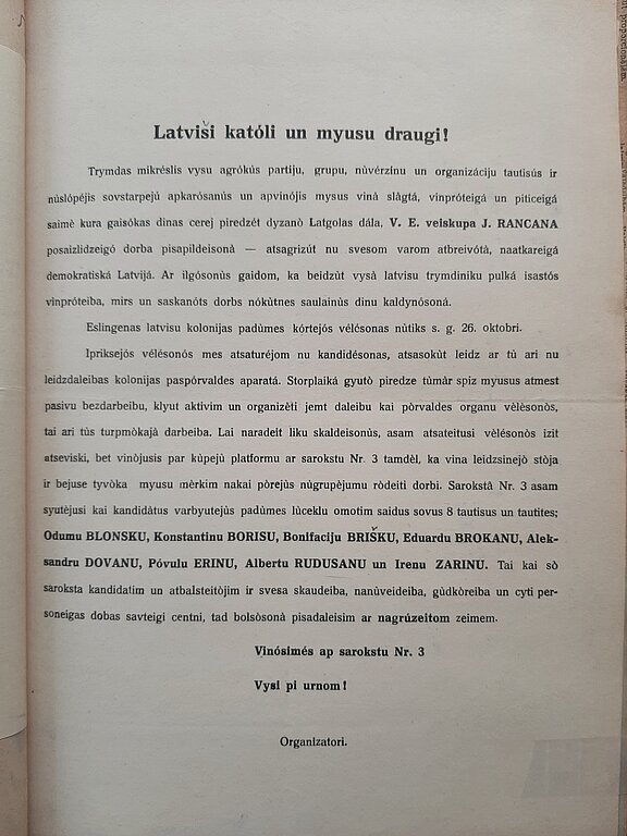 [1] Latviešu katoļu uzsaukums 1947. gada 26. oktobra Eslingenes Latviešu kolonijas padomes vēlēšanām.