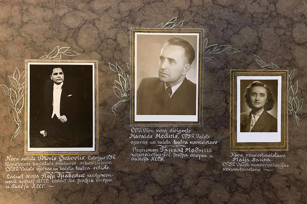 Albuma sākumā redzamas fotogrāfijas ar kora vadītājiem – diriģentu Haraldu Medni (1906-2000) un kora koncertmeistari Maiju Saivu (1924-2006). Tāpat apskatāma fotogrāfija ar Latvijas PSR Nopelniem bagāto skatuves mākslinieku, LPSR Valsts operas un baleta teātra (tagad Latvijas Nacionālā opera un balets) solistu Pēteri Grāveli (1919-1995), ar kuru kopā aizvadīti vairāki koncerti, kuros P. Grāvelis uzstājies kā solists.