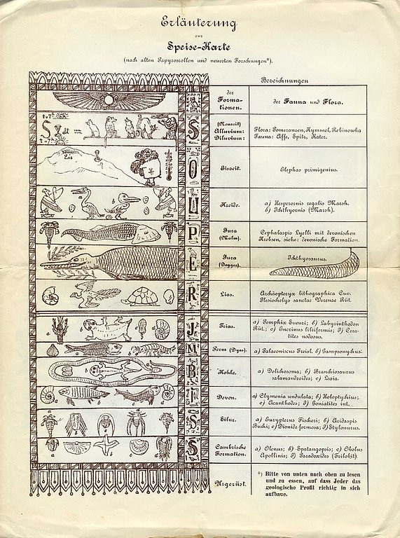 Septiņos vakarā svētku viesi pulcējās Vērmanes dārza telpās, kur norisa svētku saviesīgā daļa. Restorāna telpās bija atvērta bufete, kuras noformējumā bija izmatoti ģeoloģiskā laika motīvi. Šeit viesiem arī bija pieejama jūgendstila manierē noformēta ēdienkarte, to atverot var iepazīties ar piedāvājumu un tā skaidrojumu, kā turpat atzīmēts, vadoties pēc seniem papirusiem un jaunākajiem pētījumiem. Ēdienkarte ir veidota kā ģeoloģiskais griezums, un tajā arī ir ieteikums ēdienus lietot norādītajā secībā, no lejas uz augšu, lai svinību dalībniekam izveidotos ģeoloģiski pareizs to sakārtojums. Tika piedāvātas uzkodas, kas attēlā norādītas no kembrija līdz triasa formācijai, un vakariņas - no liasa līdz jaunlaiku alūvijam un dilūvijam. Piedāvājumā, piemēram, ir “zupa no pirmputna Archeopteryx lithographica Cuv. un no senā bruņrupuča Plesiochelys sanctae Verena Rüt. ar amonītu pastēti, pazinējiem arī koprolīti” (fosilizējušās fekālijas)[2] no liasa formācijas (pēc mūsdienu stratigrāfijas - juras sistēmas apakšējā daļa), tad “kotletes no ihtiozaura ar juras papardēm, dogera formācija” (tagad - juras sistēmas vidējā daļa), kā arī “Cephlaspis Lyelli no malma formācijas”, (kas tagad atbilst juras sistēmas augšējai daļai, kurā gan galvvairodži Cephalaspis nav dzīvojuši); mērci no devona Eurypterus (vēžskorpiona), “cepetis no (zobputna) Hesperonis regalis Marsch., krīta formācija un saldēta leduslaikmeta pamatmorēna ar silūra un devona piedevām”. Pašam pēdējam, t.i. kolonas augšai - alūvijam (straumju nogulumu) un dilūvijam jeb plūdu laikposmam (tagad tāds oficiāli netiek atzīts) atbilstošie faunas pārstāvji ir pērtiķis, špics (suņu suga) un runcis, kas vācu valodas lietotājiem varētu asociēties ar mērkaķošanos, palaidņošanos un paģirām. Šī laikmeta floru pārstāv “pomerancis, ķimelis un rjabinovka”, ko var pieņemt gan par augiem (rūgtais apelsīns, ķimenes, pīlādži) gan arī šiem augiem aromatizētiem tolaik populāriem stiprajiem alkoholiskiem dzērieniem.