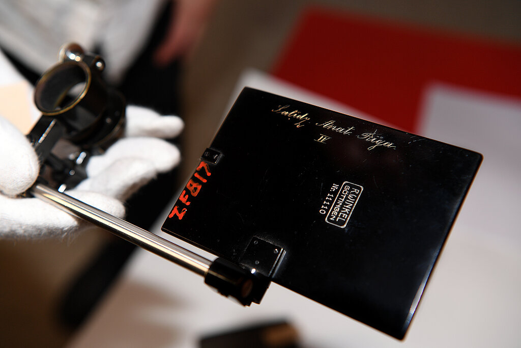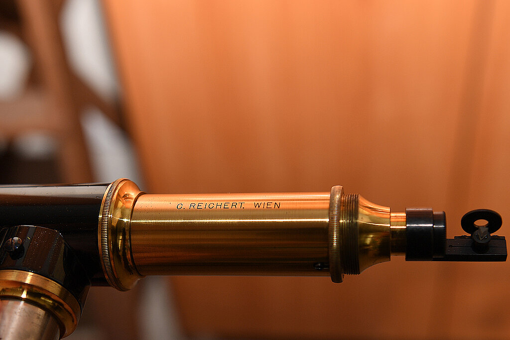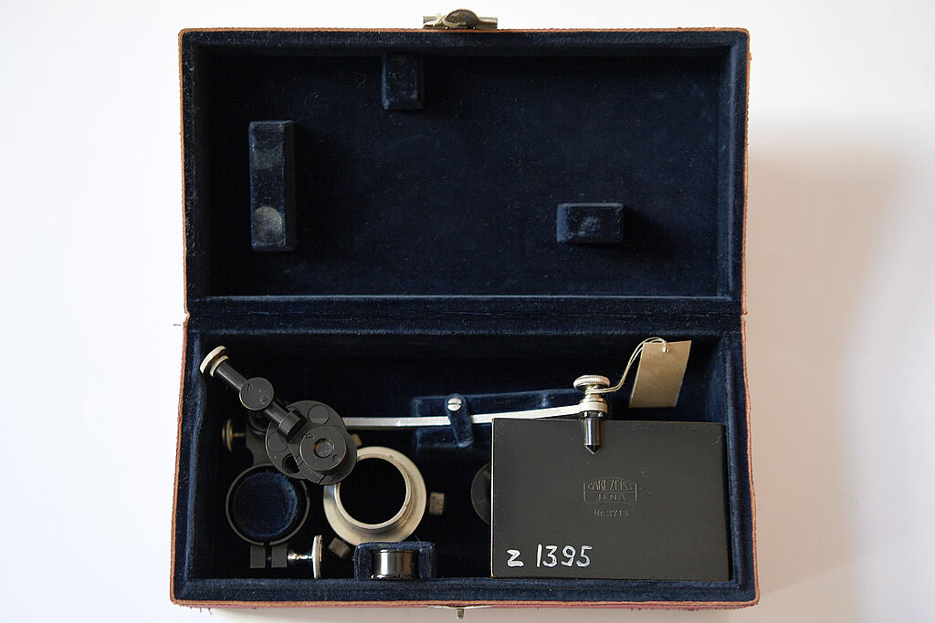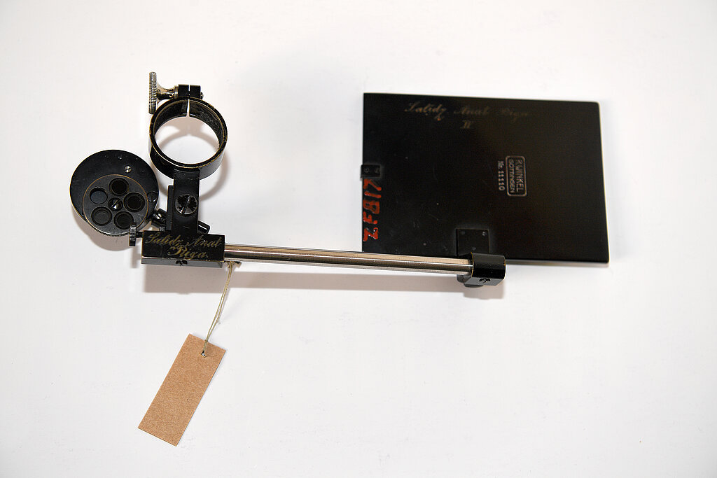 Pirmais ieraksts: “Mikroskops – binokulārais Nr. 206047; firma “E.Leitz”; klāt okulāri: 1 pāris 0; 1 pāris 3; 1 pāris 5; 1 pāris F=12; objektīvi: divi pāri; objektīva turētāji 25 mm, 32 mm, 40 mm, 48 mm, 55 mm; 1 gb. statīvs; viss koka skapītī.” Cena 300 Ls. Pēc mūsdienu mikroskopu parametriem atbilst profesionālam pētniecības mikroskopam. Minētā firma “E.Leitz” ir ievērojama firma, kas ražojusi optiskos instrumentus laikā no 1849. gada līdz 1986. gadam.